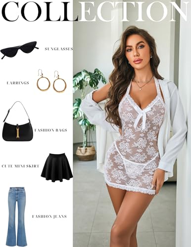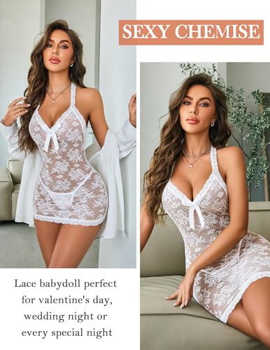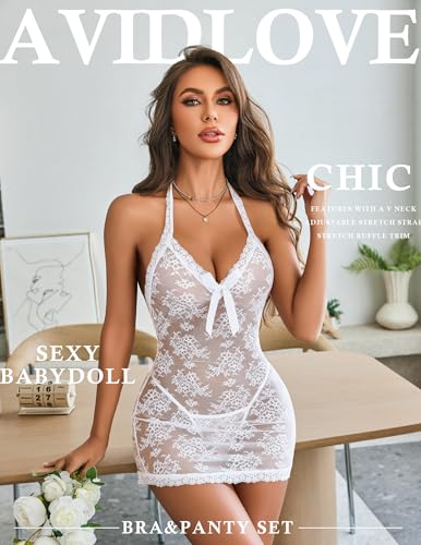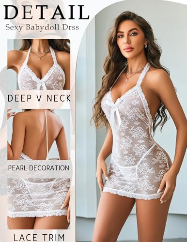 Avidlove Lingerie for Women Sexy Lace Babydoll Pearls Chemise Mesh Lingerie Dress Halter Boudoir Nightwear