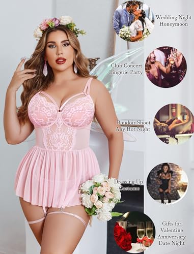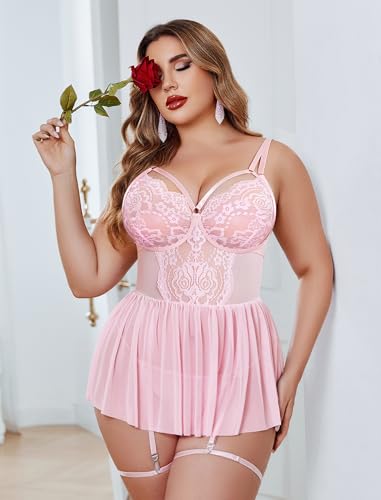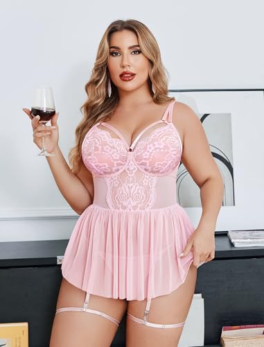 Avidlove Plus Size Lingerie for Women Sexy Lace Babydoll Mesh Chemise Boudoir Nighty with Garter Belt