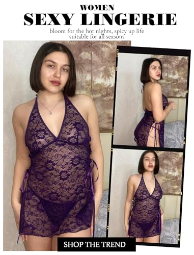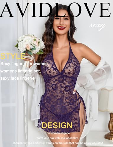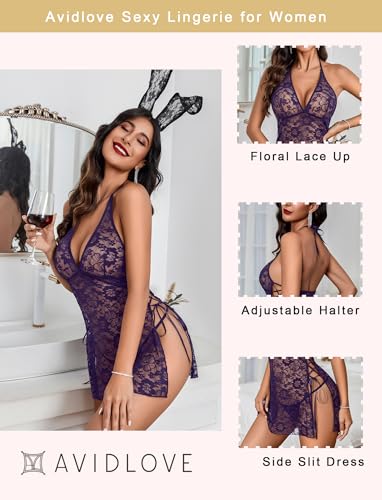Avidlove Sexy Lingerie for Women Deep V-Neck Lace Babydoll Chemise Sleepwear Side Slit Boudoir Outfits