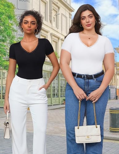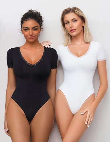 Avidlove Short Sleeve Bodysuit for Women Lace V Neck Body Suits Double Lined Bodysuits Sexy Going Out Top