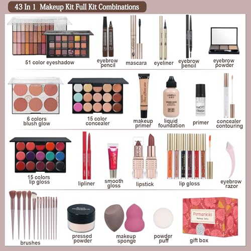 ??All In One Makeup Set??A perfect starter makeup kit that includes eyeshadow palette, loose powder, lipgloss, lipstick, concealer cream, makeup brush, concealer palette, eyebrow powder, high-gloss lying silkworm brightening powder, concealer, eyeliner, lip balm, mascara, foundation, powder puff, travel bag. All women's essentials in one elegant box and a great gift for any occasion.