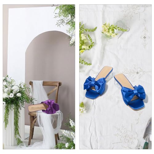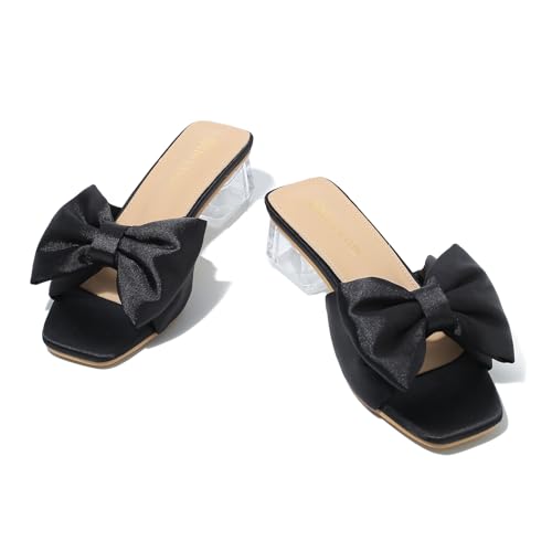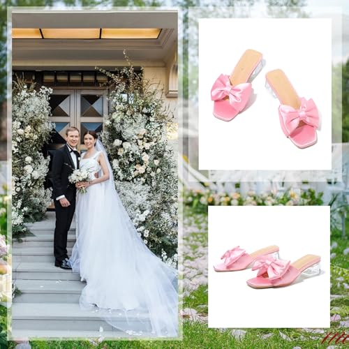 Heiyom Women's Square Toe Low Block Chunky Heels Mules Sandals Bowknot Slip on Clear Heels Wedding Bridal Party Dress Shoes
