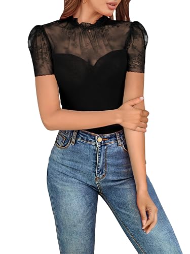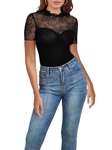 SEBOWEL Women Sexy Floral Lace Mesh Bodysuit Short Sleeve Sheer See Through Mesh Bodysuit Tops Going Out Tops Romper Clubwear