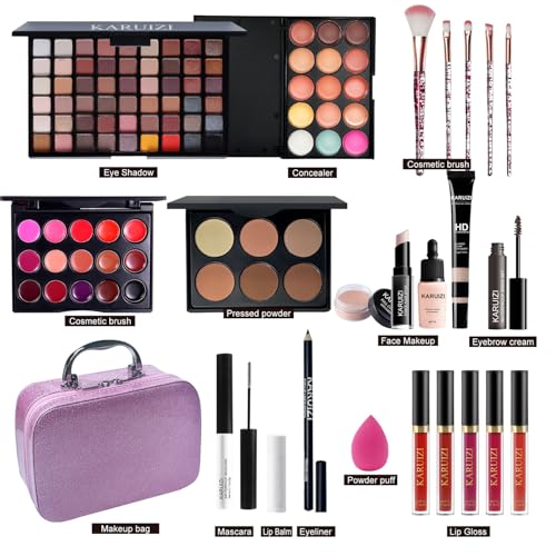 Comprehensive Kit: This all-in-one makeup set includes everything needed for a complete look - eyeshadow palettes, blush, concealer, lip glosses, brushes, and a convenient storage bag.