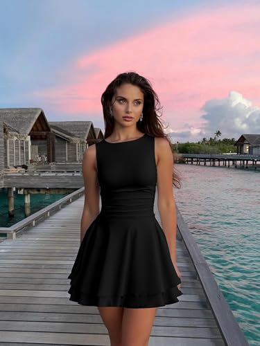 Kaximil Women's Ruffle Hem Boat Neck Mini Dress Sleeveless Ruched Corset Short Party Dresses