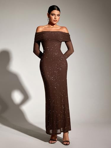 KUTUMAI Women Off Shoulder Bodycon Maxi Dress Long Sleeve Mesh Ruched Party Formal Wedding Guest Dresses