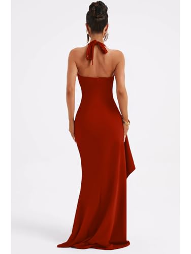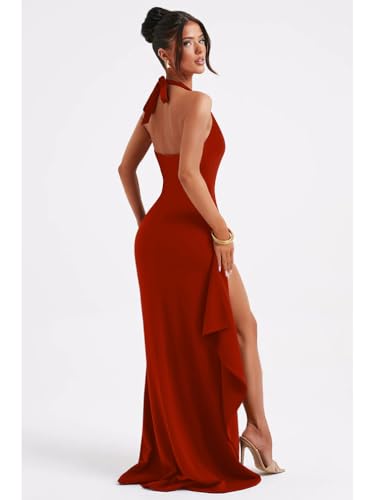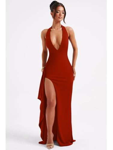LAGSHIAN Women's Sexy Deep V Neck Halter High Split Backless Cocktail Party Formal Maxi Dress