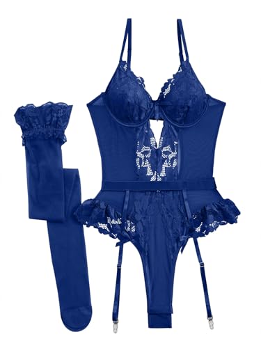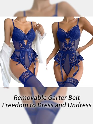 Lilosy Sexy Stocking Lace Mesh Bodysuit Top Underwire Garter Lingerie Set 3 Piece