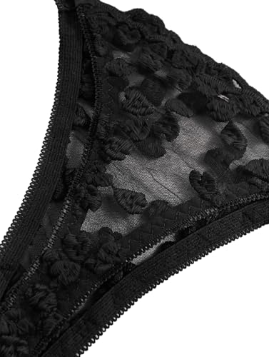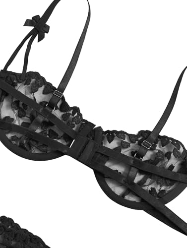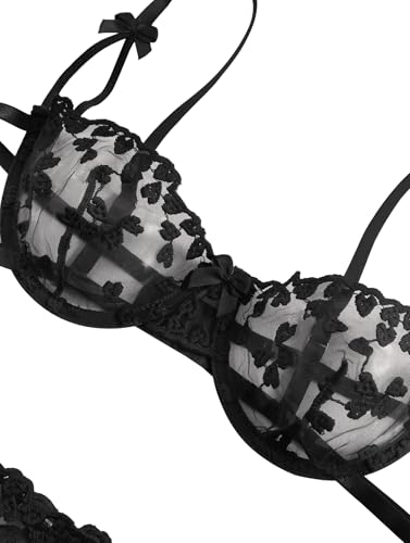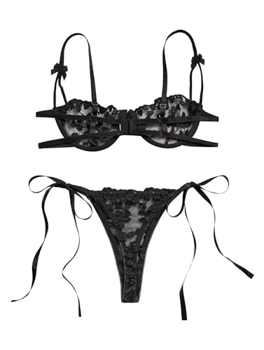 Lilosy Sexy Tie Side Cute Underwire Push Up Strappy Embroidered Mesh Sheer Lingerie Set