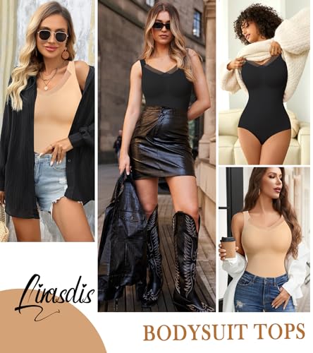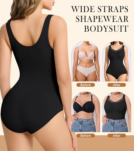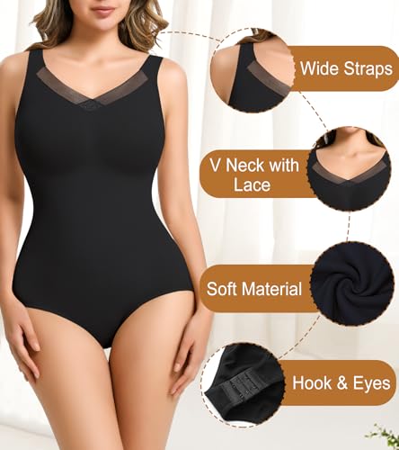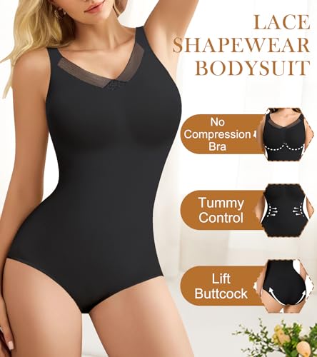V Neck Shapewear Bodysuit for Women, Lace Wide Straps Tummy Control Brief Body Shaper, Seamless Body Suit