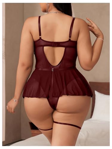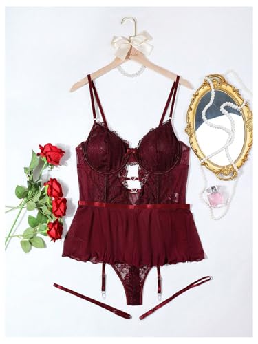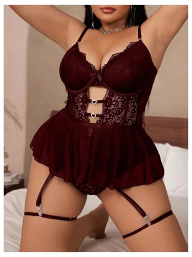 MakeMeChic Women's Plus Size Teddy Lingerie Sets with Garter Cut Out Floral Lace Exotic Lingerie Bodysuit