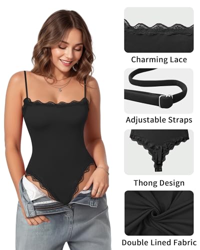 MANGOPOP Women's Cami Thong Bodysuit Double Lined Square Neck Backless Body Suit Adjustable Spaghetti Strap Tank Tops