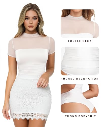 MANGOPOP Womens Short Sleeve Bodysuits Mock Turtle Neck Bodysuit Tops Ruched Sheer Mesh Sexy Going Out Body Suit Shirts