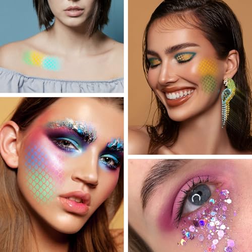 Mermaid Scale Stencil Kit,11Pcs Reusable Mermaid Face Makeup Templates and 4 Pcs Makeup Brushes 2 Bottles Glitter, Women Girls Body Art Face Painting Wall Accessories