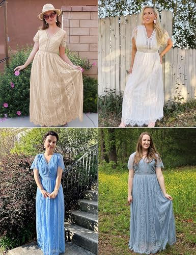 MEROKEETY Women's V Neck Short Sleeve Floral Lace Wedding Dress Bridesmaid Cocktail Party Maxi Dress
