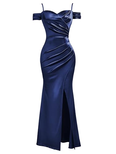 Miusol Women's Sexy Off Shoulder Satin High Split Ruched Style Evening Party Maxi Dress