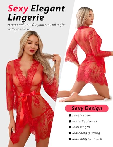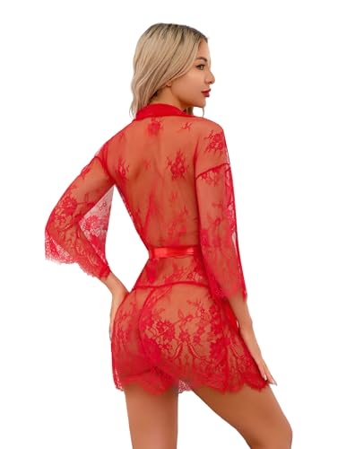 Narcisse Women's Lingerie Lace Kimono Robe Mesh Nightgown for Women Chemise Babydoll Lingerie Cover Up Sheer Robe with Belt