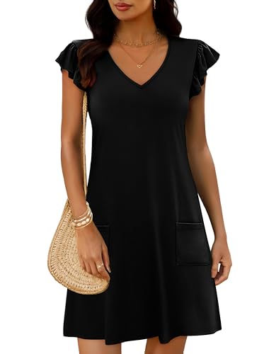 OFEEFAN Womens Summer Dresses 2025 Ruffle Sleeve V Neck Loose Swing Sundresses with Pockets Plain/Print