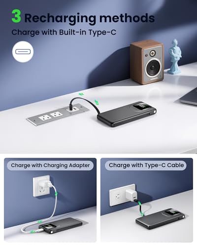 Portable Charger Power Bank with Built-in Type C Cables, 22.5W Fast Charging 10000mAh Phone Charger, Travel Battery Pack Slim Battery Bank with Smart LED Display for iPhone, Android & USB-C Devices