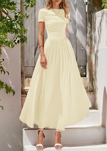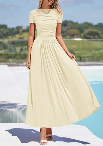 PRETTYGARDEN Women's Casual Dresses 2025 Summer Short Sleeve Ruched Patchwork A Line Pleated Swing Maxi Dress with Pockets