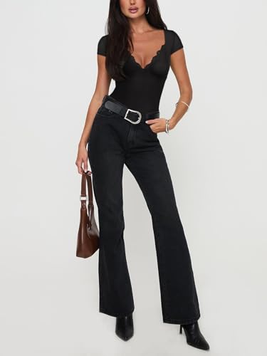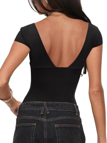 REORIA Womens Deep V Neck Bodysuit Double Lined Lace Bodysuit Short Sleeve Backless Top Sexy Going Out Outfits