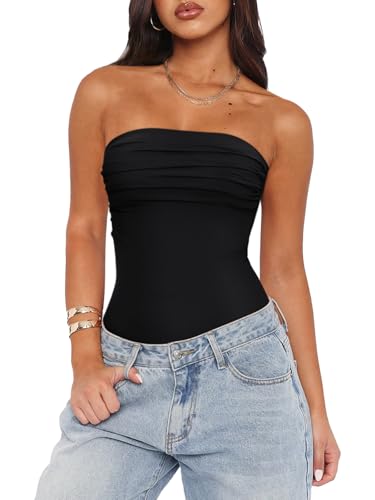 REORIA Women's Sexy Strapless Ruched Bodysuit Tube Top Sleeveless Trendy Body Suits