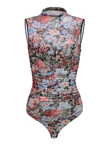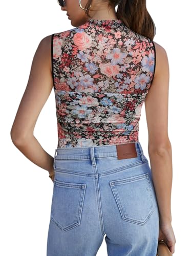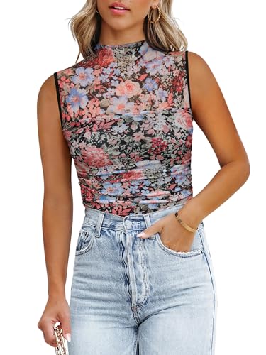 REORIA Women??s Sheer Mesh Sexy Bodysuits Mock Neck Sleeveless Shirts Ruched Trendy Going Out Bodysuits Tops 2025