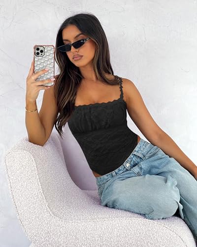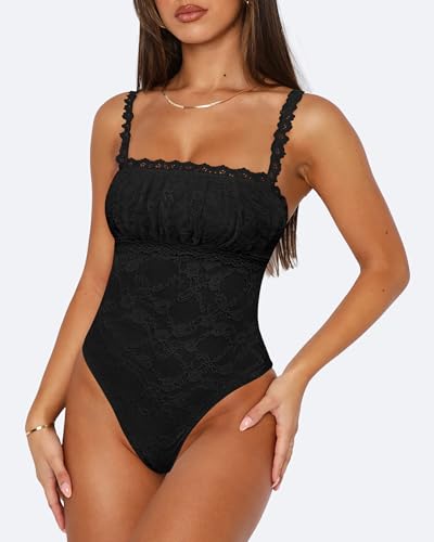 Saslax Women's Sexy Square Neck Lace Sleeveless Bodysuit Tank Tops Double Lined Body Suit Thong Outfits
