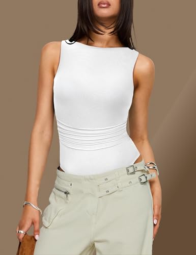 SAUNGKUAI Women's Sleeveless Shirts Mesh Ruched Bodysuit Double Lined Boat Neck Body Suits Going Out Tops Date Outfits