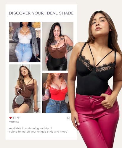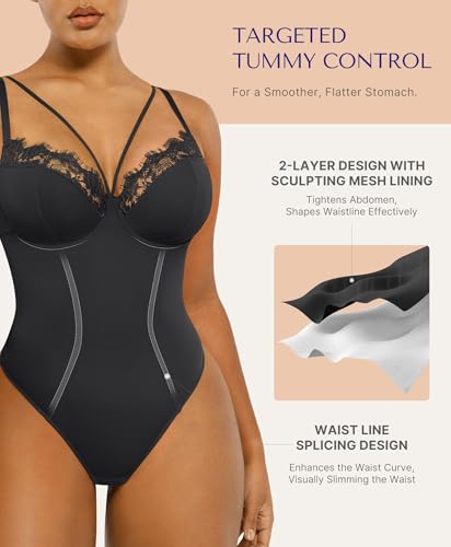 SHAPELLX Women's Shapewear Bodysuit Tummy Control Body Shaper Lace Sculpting Snatched Waist Body Suit V Neck Thong Bodysuit