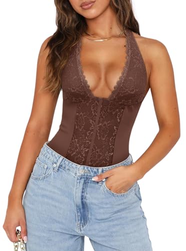 Summer Sexy Floral Lace Halter Deep V Neck Sleeveless Backless Trendy Going Out Corset Body Suits