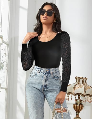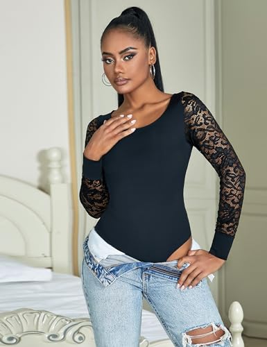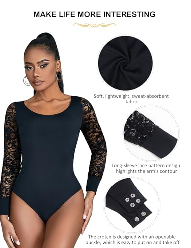 Lace Bodysuit Long Sleeve Leotards for Women Sexy Round Neck Body Suit Tops Openable Crotch Going Out Tops S-2XL