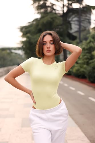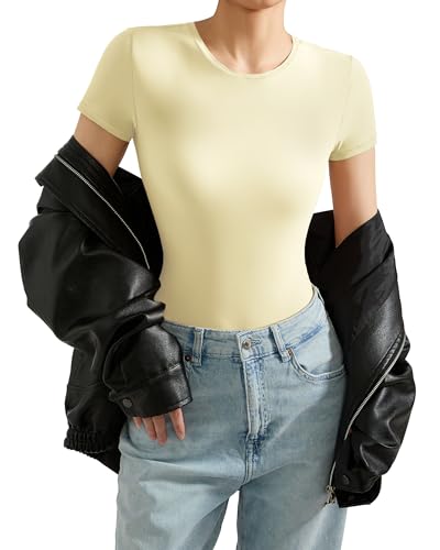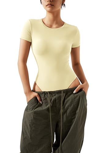 SUUKSESS Women Crew Neck Short Sleeve Thong Bodysuit Shirts Basic Top