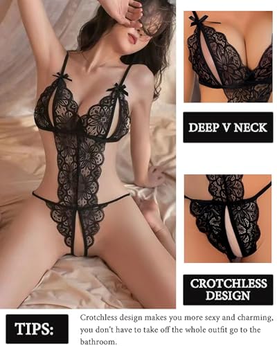 Women's Sexy Lace Lingerie Bodysuit - Adjustable Halter One-Piece Teddy Lingerie Crotchless with Sheer Mesh
