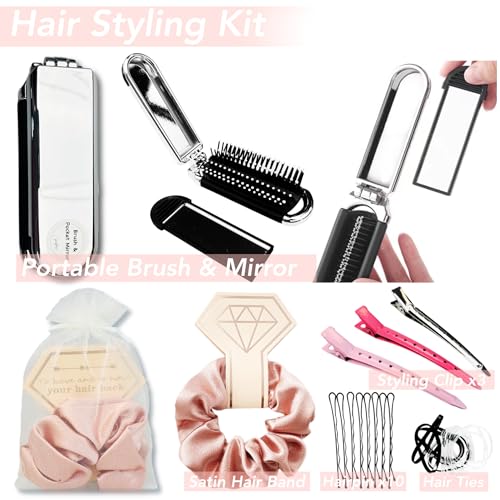Hair Brush, Hair Ties and Sewing Kit: The womens survival kit also includes a silver retractable hair brush that has a removable mirror for last minute checks. It folds up for storing convenience. There is a pink/white satin hair tie. There are also clear and black hair bands. In addition there are 3 multi-color hair clips, 10 bobby pins, all stored in a beautiful mesh pouch with a bow tie. The sewing kit has pins, sewing needles, 6 colors of thread, scissors, buttons, safety pin and more.