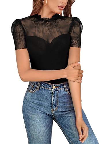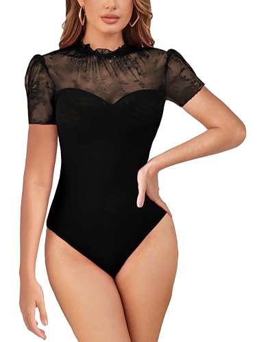 Women's Sheer Lace Crochet Splicing Mesh Short Puff Sleeve Bodysuit Mock Turtle Neck Body Suit Going Out Tops