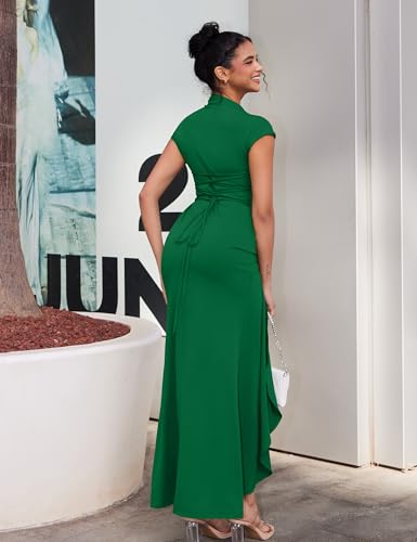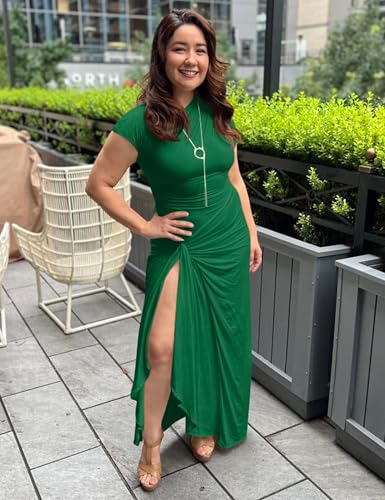YMDUCH Women's Casual Short Sleeve Boat Neck Ruched High Split Bodycon Long Party Dress